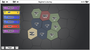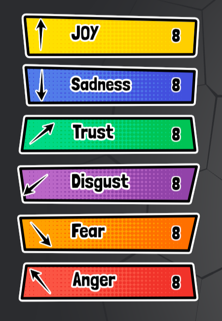 Your weapons are emotions. The deck consists of 6 emotion types (like Joy, Fear, Disgust) with strengths ranging from 1 to 8.